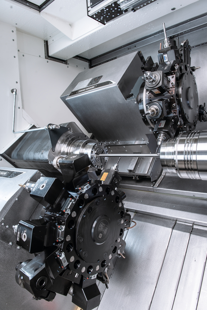 Short components are removed using a gripper in the machining area and a parts dispenser. Longer workpieces are output by the right hand spindle and picked up by an unloading system. Communication between loading and unloading ensures that the bar material is used optimally and in a resource-saving manner.